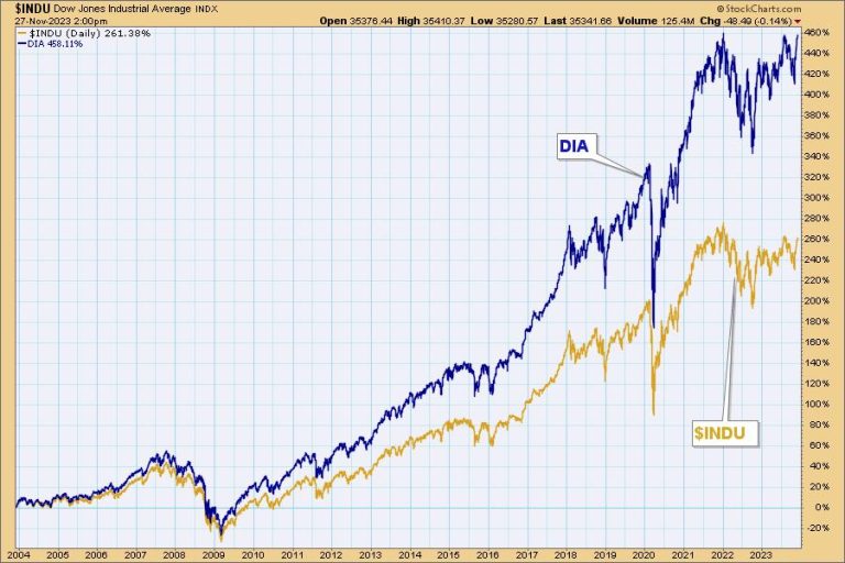 I quickly discovered the problem. The symbol $INDU is the official Dow Jones Industrial Average, but the problem is that the data for this symbol are not adjusted for dividends, as with the data for stocks, mutual funds, and ETFs. In fact, none of data for the major market indexes ($SPX, $NDX, $NYA, $COMPQ, etc.) are adjusted for dividends, so if you want to perform technical analysis on them, it is best to use the corresponding ETF.